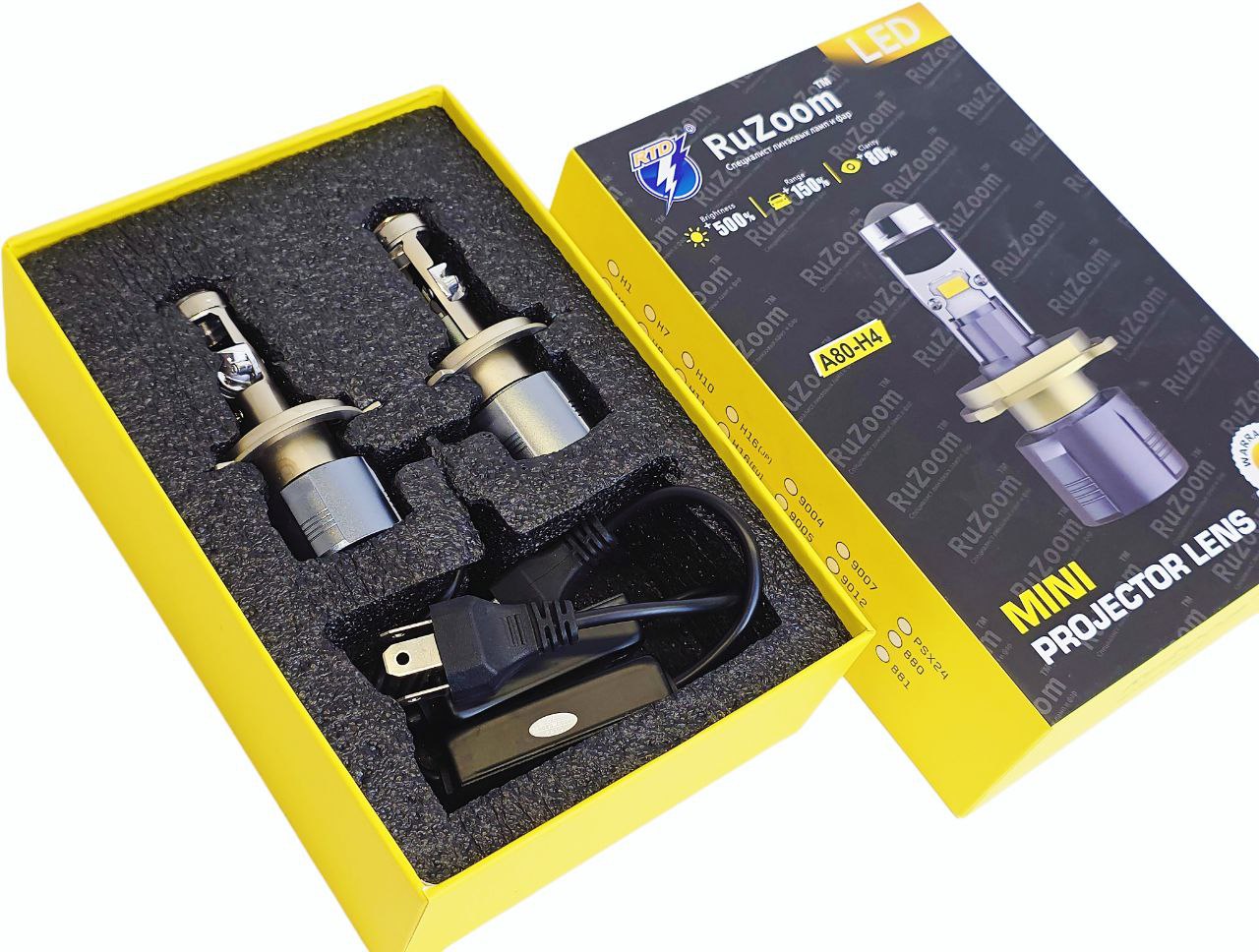 Светодиодные лампы мини линзы A80 H4 создают яркий световой пучок с равномерной заливкой без пересветов и четкой СТГ, обеспечивая хорошую видимость в любых погодных условиях и не ослепляя встречный поток.