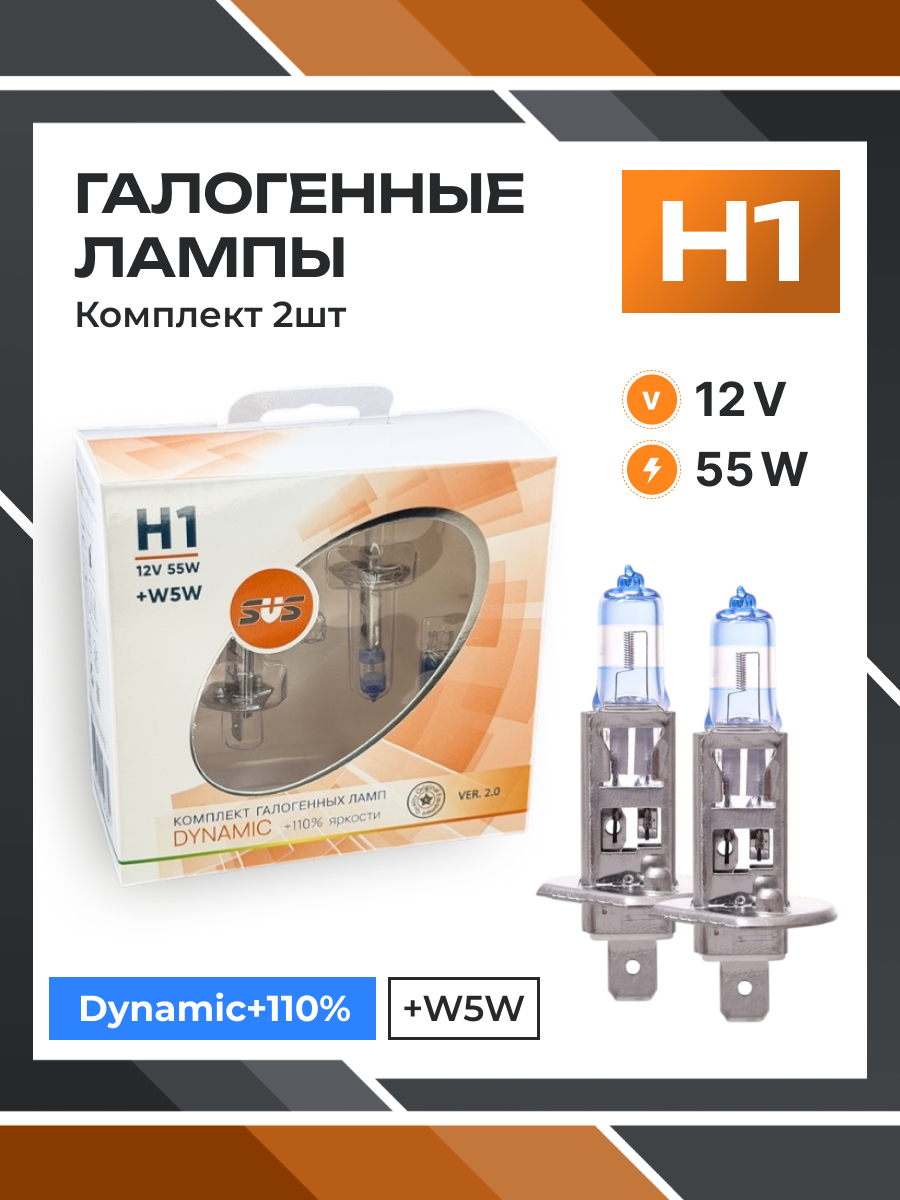 Галогенные лампы серия Dynamic+110% 12V H1 55W+W5W, комплект 2шт. Ver.2.0